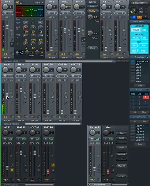 TotalMix FXのエフェクト機能はレコーディング・チェーンに柔軟性をもたらすだけでなく、CPU負荷の高いソフトウェア・エフェクトの代替としても機能します。また、スタジオ・モニター用と、ボーカル・ブースのヘッドフォン用に別々のエフェクトをかけるなど、レコーディングの現場での需要に的確に応えることができる究極のソフトウェア・ミキサーがTotalMix FXなのです。